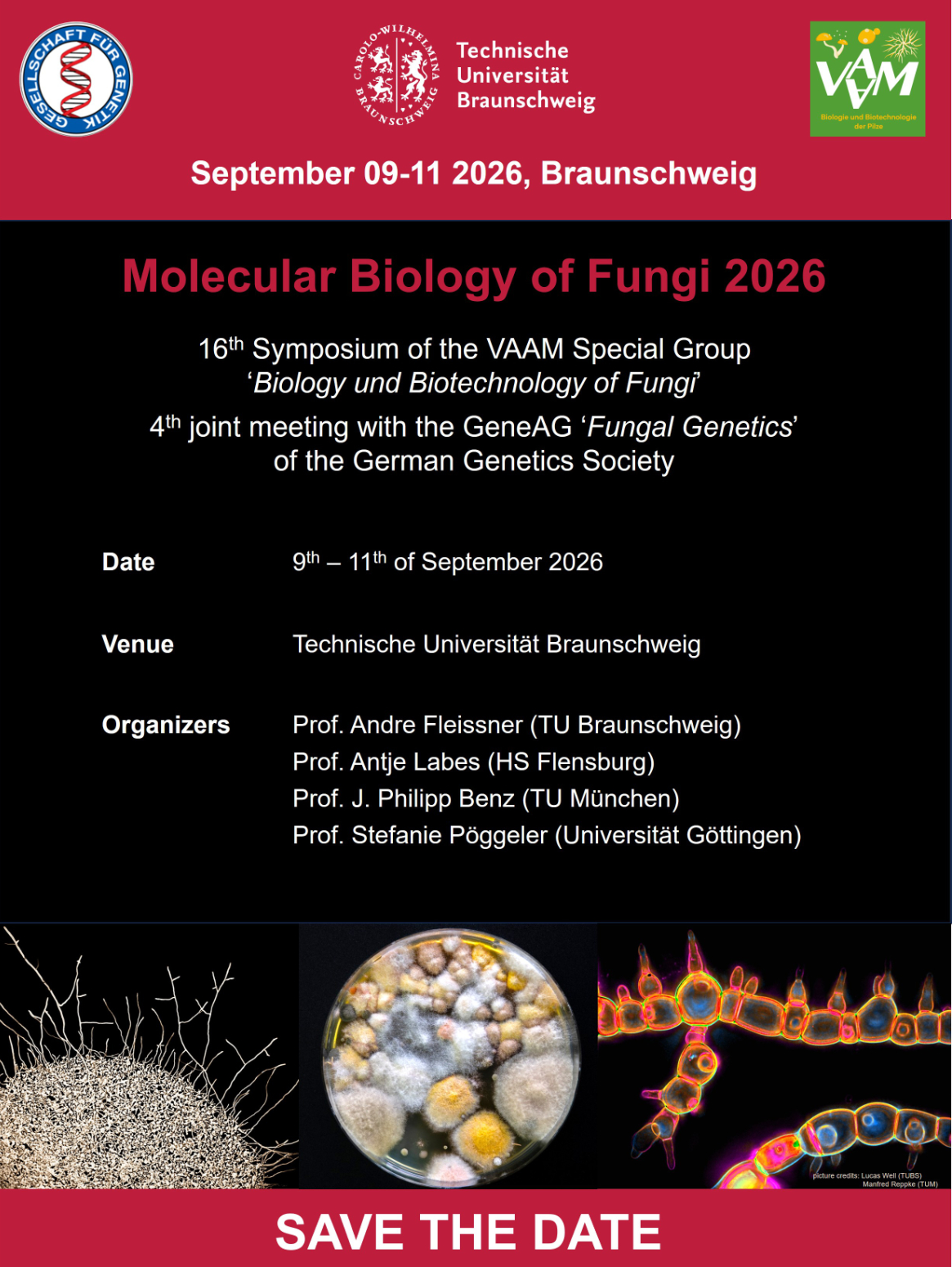 Die alle zwei Jahre stattfindende Fachtagung „Molecular Biology of Fungi“ der VAAM Fachgruppe Biologie und Biotechnologie der Pilze wird vom 09.-11. September 2026 zum vierten Mal gemeinsam mit der GenAG „Pilzgenetik“ der Gesellschaft für Genetik Braunschweig veranstaltet werden. Die MBF wird seit 1993 alle zwei Jahre an unterschiedlichen Orten in Deutschland abgehalten und ist seit 2019 eine gemeinsame Tagung der GfG „Gen AG Pilzgenetik“ und der VAAM Fachgruppe „Biologie und Biotechnologie der Pilze“. Die Tagung möchte vor allem junge Wissenschaftler im Bereich der Pilzgenetik fördern und ihnen die Gelegenheit bieten ihre Forschung einem breiten Fachpublikum vorzustellen. Weitere Informationen folgen.